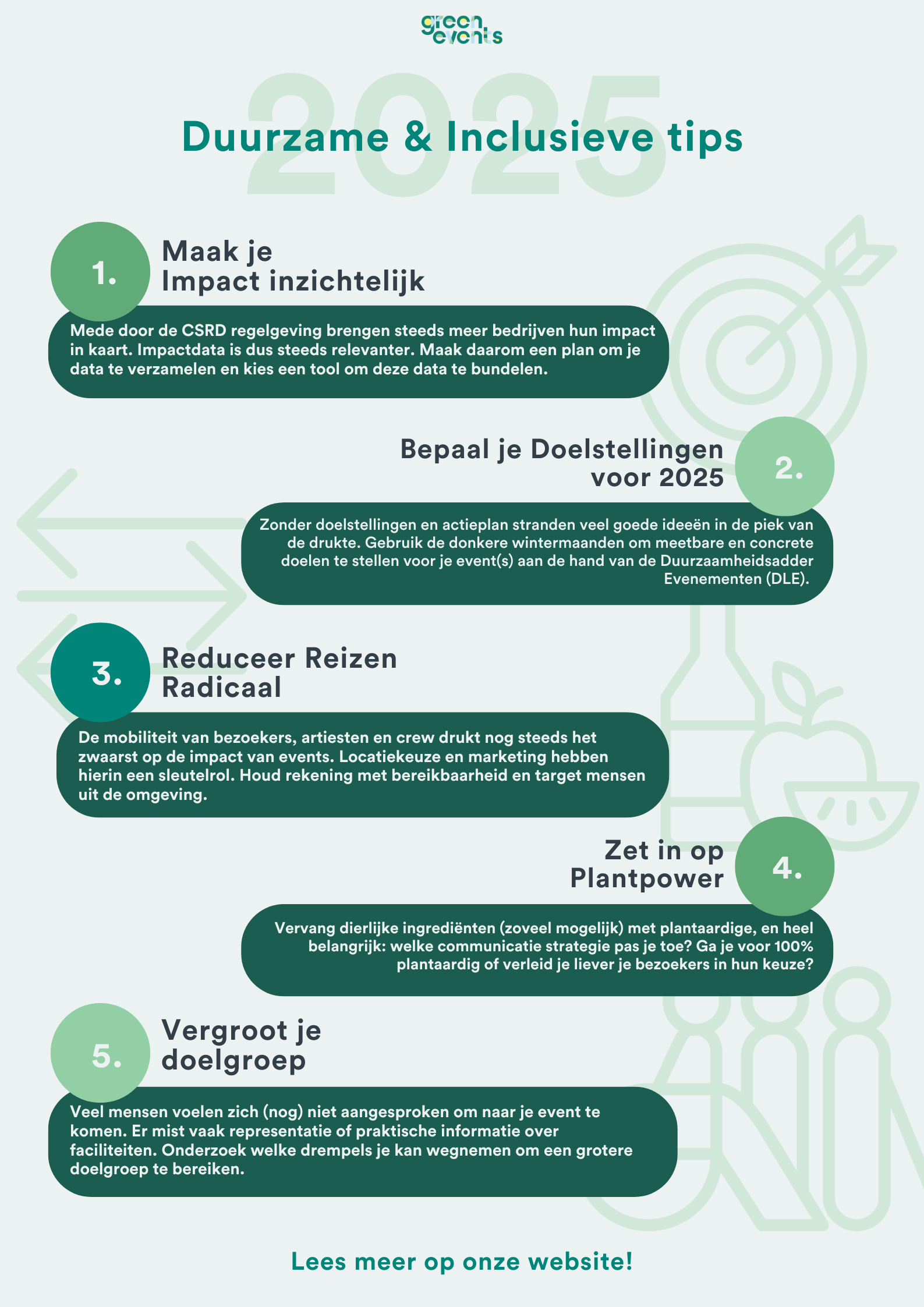 Zonder doelstellingen en actieplan stranden veel goede ideeën in de piek van de drukte. Gebruik meetbare en concrete doelen te formuleren voor je event(s) in 2025. Een hulpmiddel hierbij is de Duurzaamheidsadder Evenementen (DLE). Download deze hier.