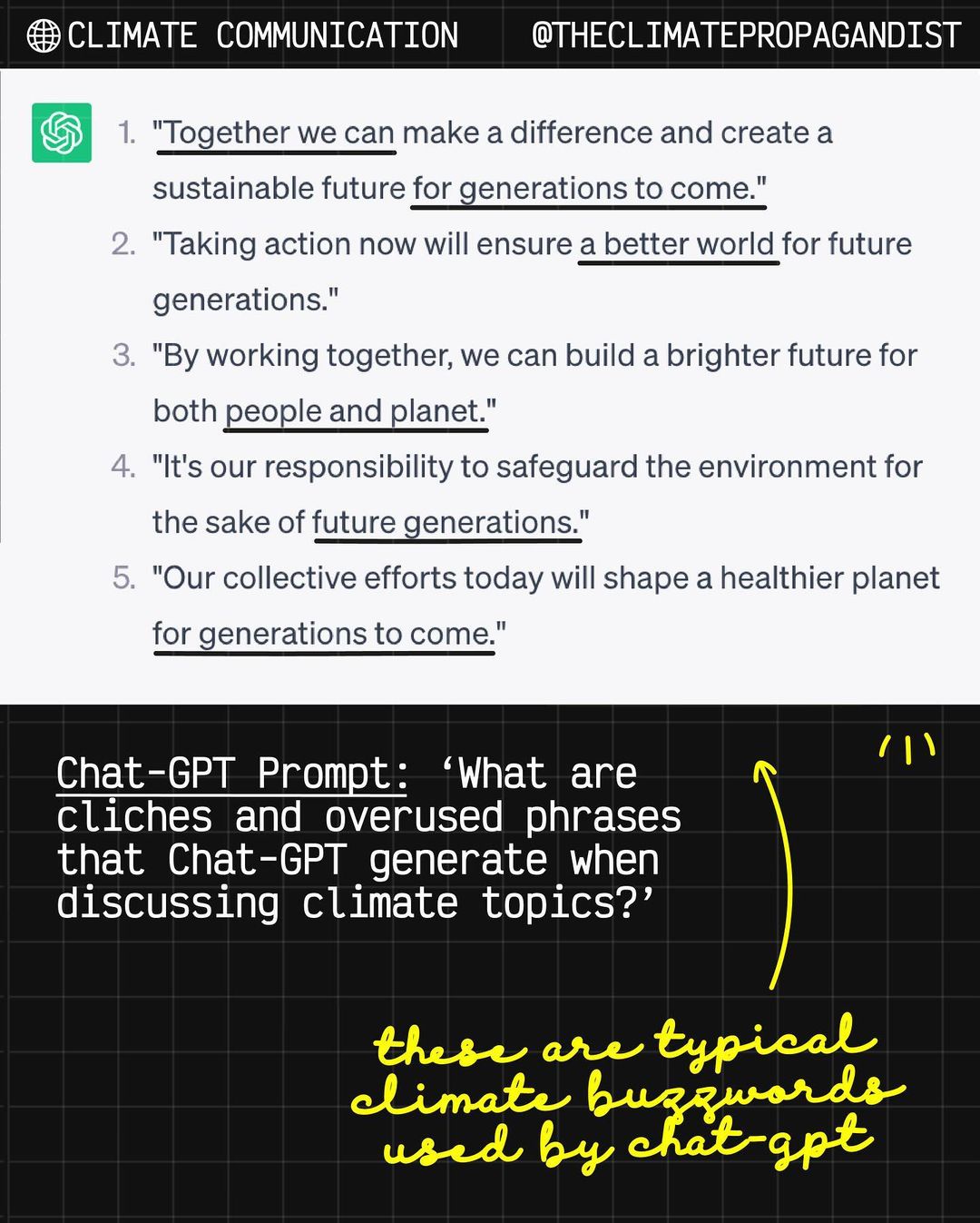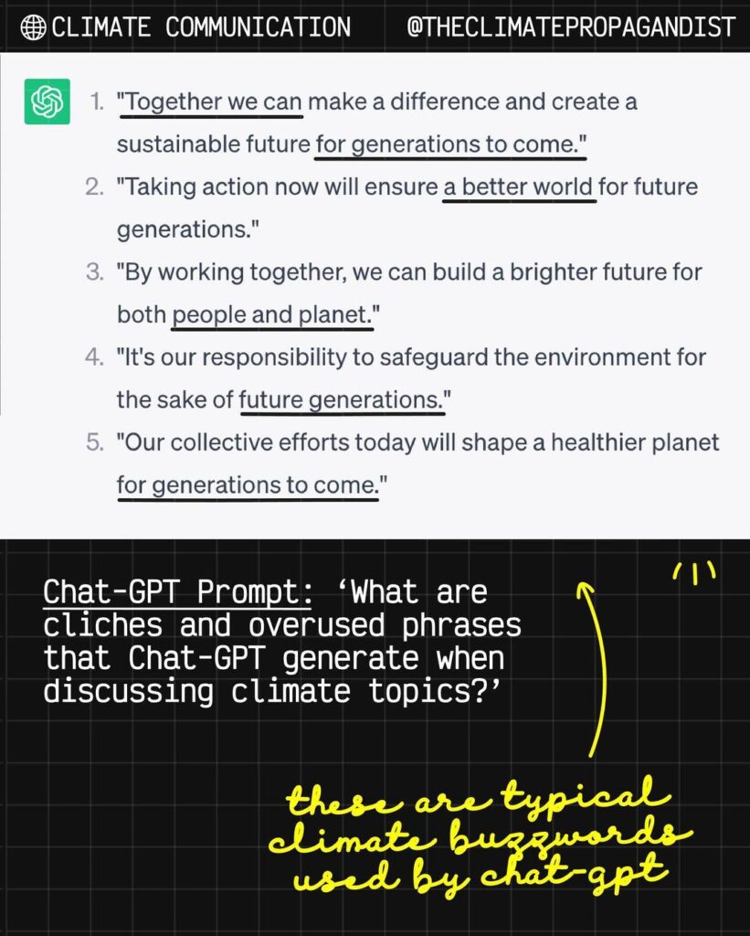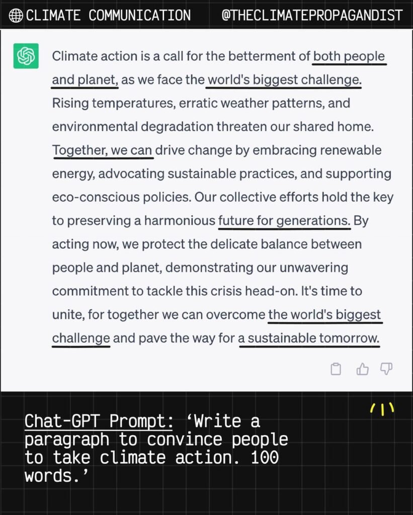 Let’s examine a different aspect of Chat-GPT’s impact on climate – not its significant carbon footprint, but the way it affects our climate communications.