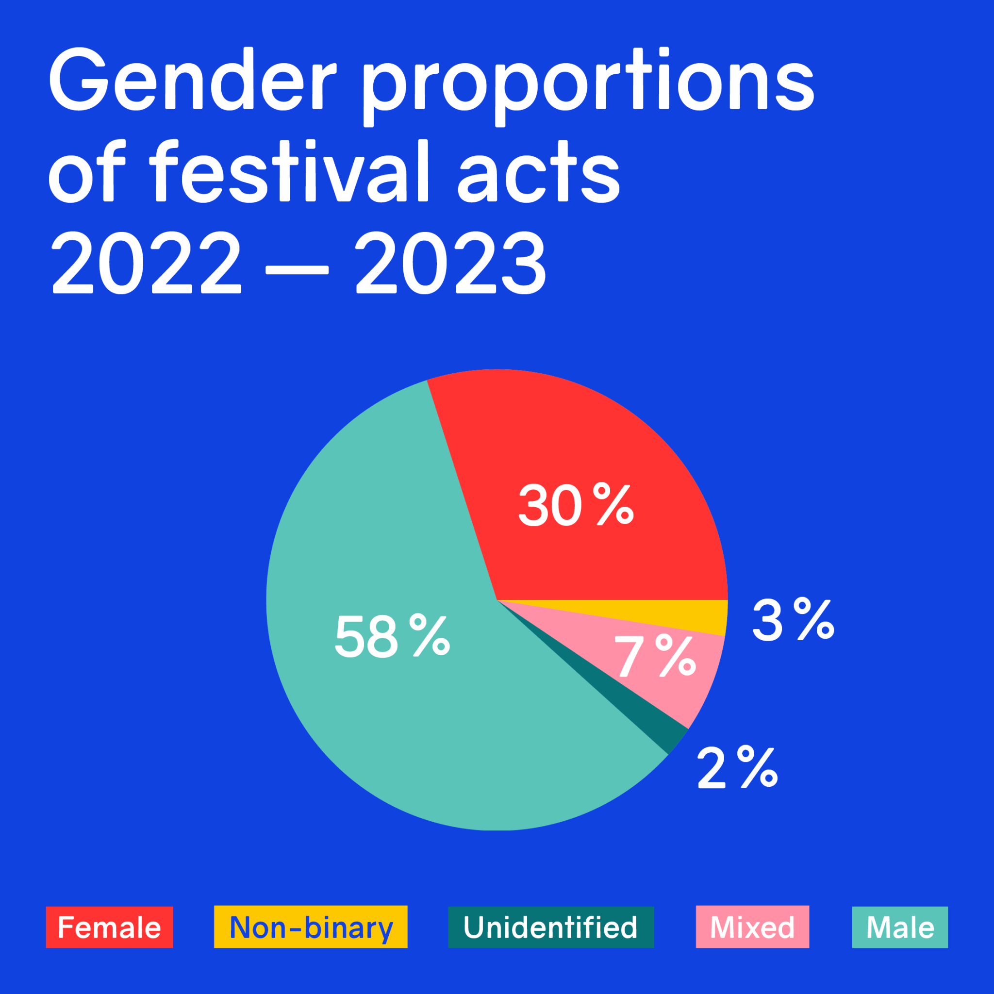 “We collected data for 175 festival editions [of 110 unique festivals] that took place in 2022 and 2023. Adding this to the previous data, female:pressure has collected data for 1008 festival editions [281 unique festivals in total] from 2012 to 2023 from 50 countries. The proportion of female acts rose from 9.2% in 2012 to 29.8% in the current reporting period of 2022 to 2023. In 2022/23, 2.5% of all acts surveyed were non-binary and 6.9% were mixed in comparison to 58.4% male acts. Larger festivals tend to have lower proportions of female and non- binary acts. Publicly funded festivals and festivals with female artistic directors have higher proportions of female acts.”