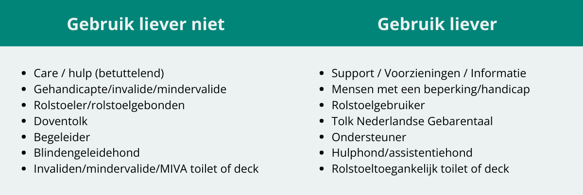 Vaak wordt de informatie over toegankelijkheid zeer beknopt onder de FAQ gezet, daarbij wordt hier meestal alleen gericht op rolstoelgebruikers. Mensen met andere beperkingen worden hierdoor niet overtuigd om te informeren of er ook faciliteiten voor hen aanwezig of mogelijk zijn.