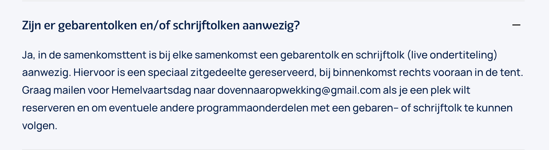 Wij raden je aan om de toegankelijke informatie zowel bij de FAQ te plaatsen als te bundelen onder een pagina die in het hoofdmenu gemakkelijk te vinden is. Awakenings Festival is hierbij een goed voorbeeld.