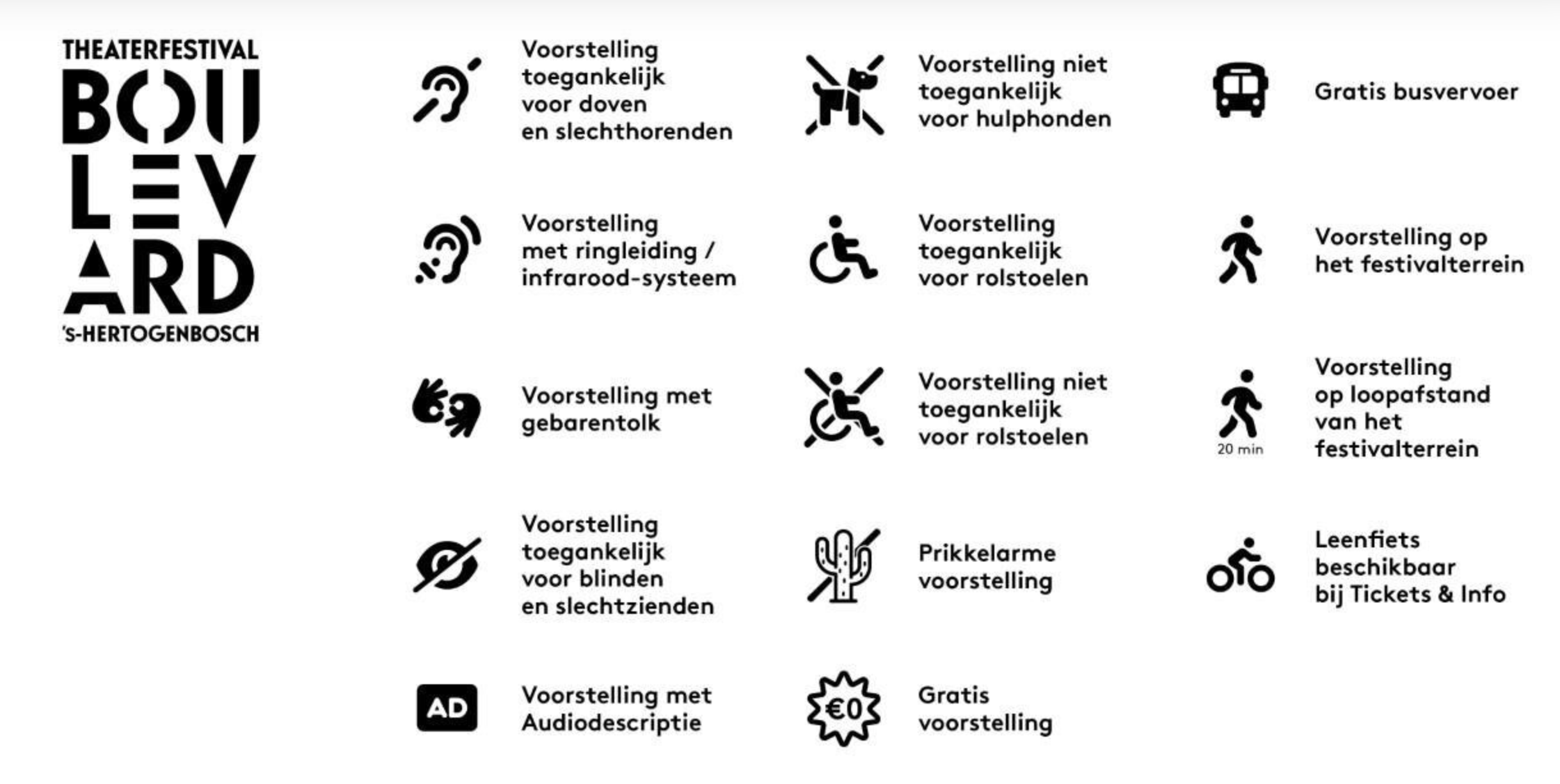 1. Voor welke beperkingen is het festival toegankelijk? Wees hierin specifiek en eerlijk, dus als je het hebt over een rolstoel, bedoel je dan ook elektrische rolstoelen of alleen hand beweegbare rolstoelen? Bekijk hier de toegankelijke termen van Theaterfestival Boulevard en onderstaand de iconen gebruikt bij de voorstellingen.