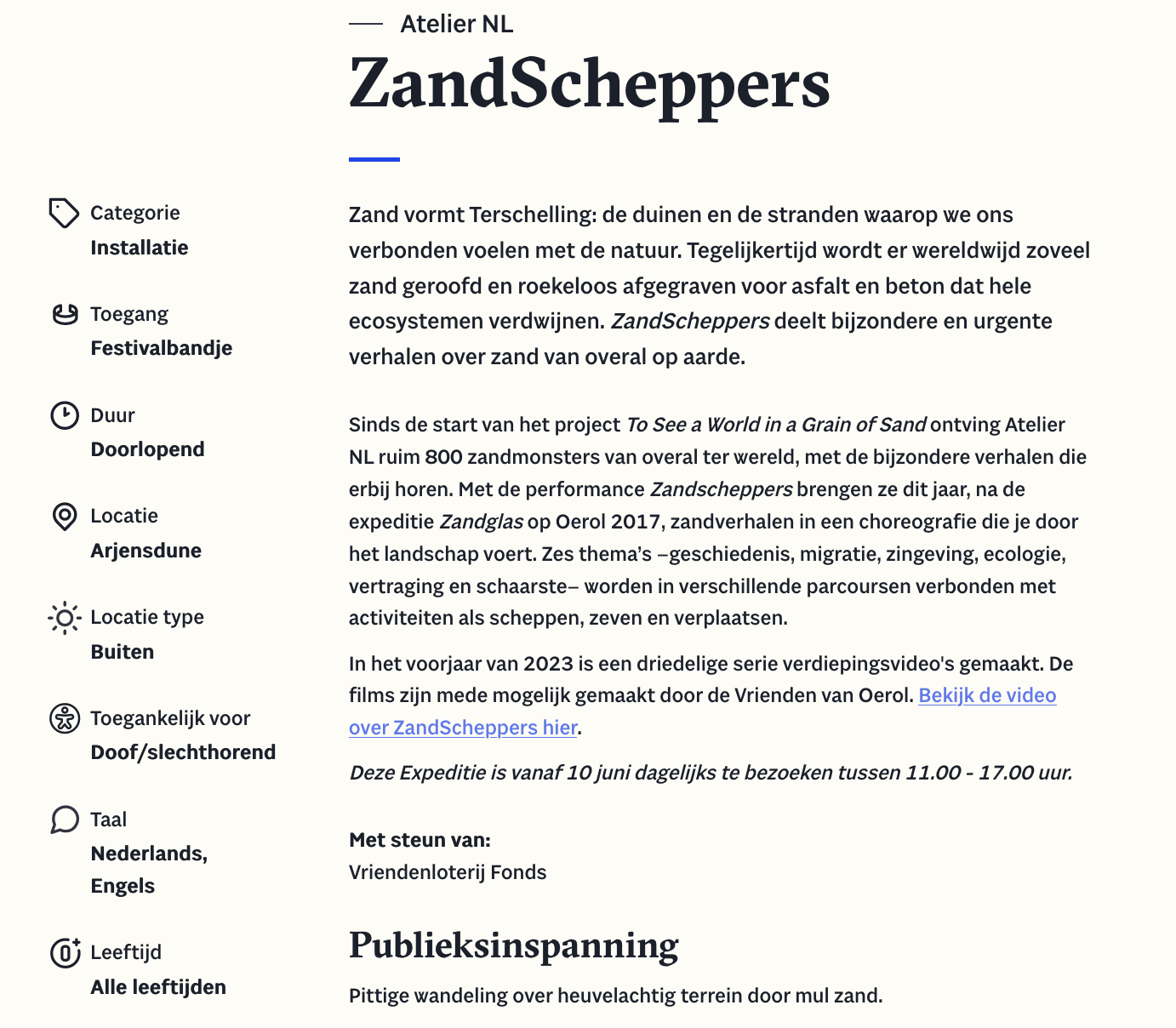 Voorbeeld: Oerol Festival deelt per programma toegankelijkheidsinformatie en publieksinspanning