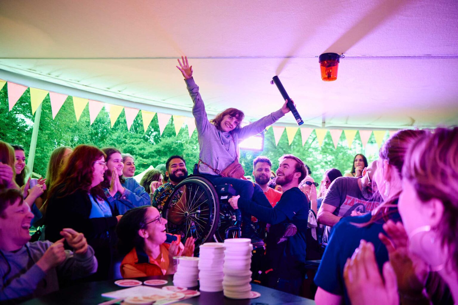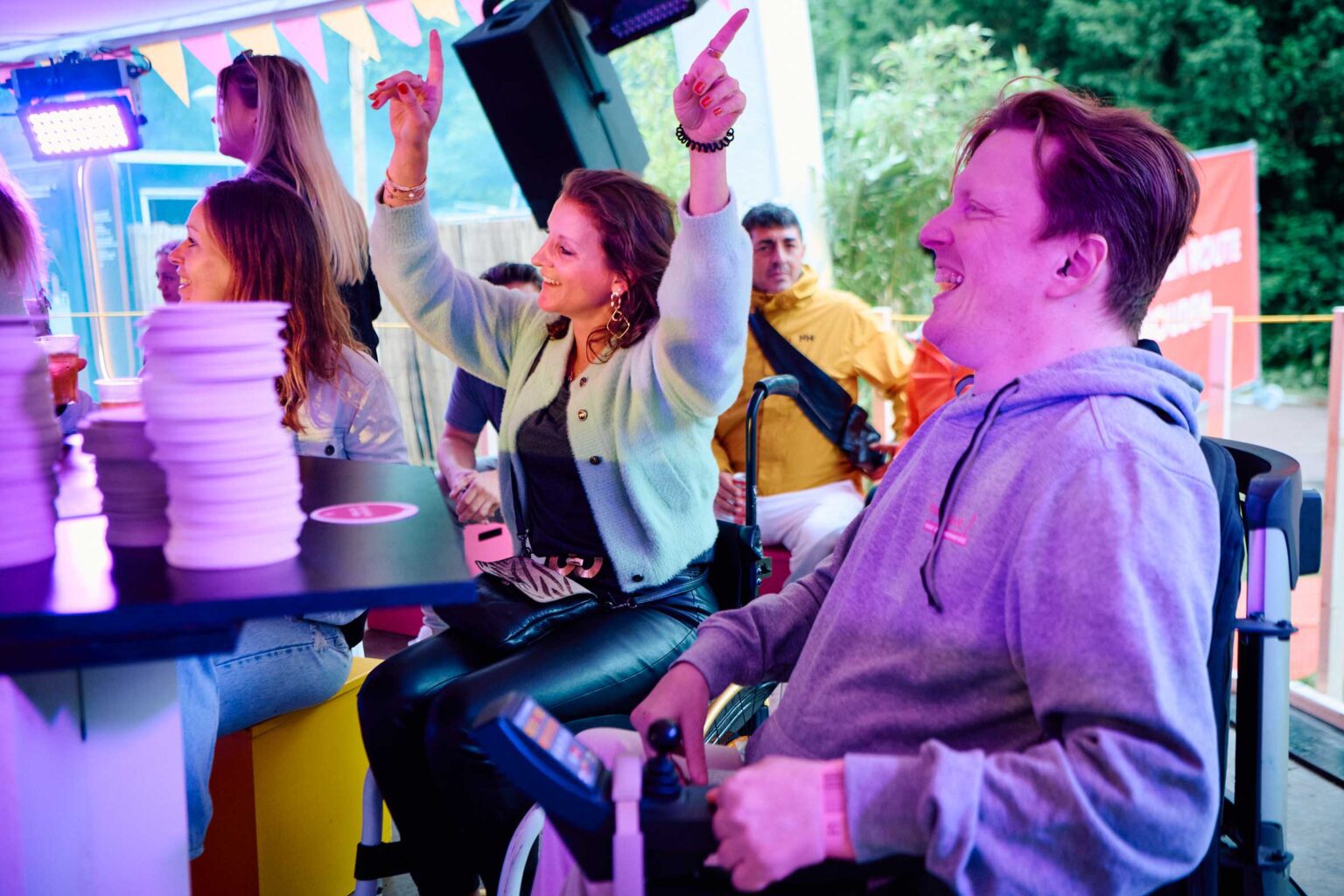 In het Sitdown Café zakt het dak van de tent meerdere keren naar beneden, waardoor rolstoelgebruikers en andere bezoekers letterlijk op gelijke hoogte komen te staan. Dit bevordert een gevoel van gelijkwaardigheid en maakt interactie tussen alle aanwezigen makkelijker. Door mensen met beperkingen actief te betrekken bij publieke evenementen, ontstaat er meer bewustzijn en begrip voor hun behoeften en ervaringen.
