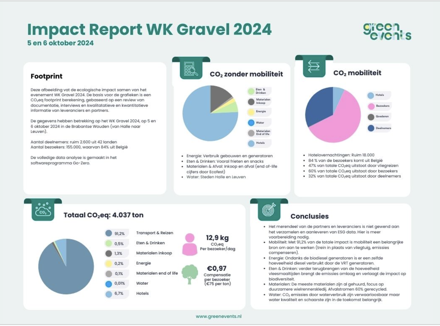 De totale uitstoot van het WK Gravel 2024 is berekend op 4.037 ton CO₂eq. Dit komt overeen met de jaarlijkse uitstoot van 133 Belgische huishoudens. Om deze uitstoot te compenseren, zouden 13.500 bomen moeten worden geplant, die vervolgens minstens 30 jaar moeten groeien (= ongeveer 13 hectare bos). Transport en reizen kwam als zwaartepunt uit het rapport, met meer dan 90% van de totale CO2-uitstoot. Hier is dan ook de meeste winst te behalen; denk hierbij aan treinen in plaats van vliegtuigen en het compenseren van emissies.