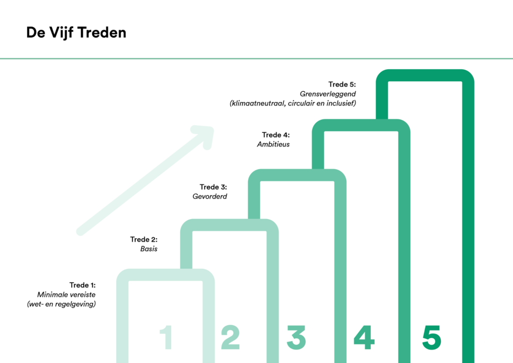 De DLE werkt met een groeimodel van 5 treden, waarbij de mogelijkheid om te klimmen motiveert om verder te ontwikkelen. De 5 treden geven ruimte om als organisator, gemeente of leverancier zelf het ambitieniveau te bepalen en de bijbehorende stappen te ondernemen. ‘’Omdat het ambitieniveau voor elke organisatie verschillend is leek standaardisering ingewikkeld. Daar hebben we met de 5 treden in de duurzaamheidsladder een oplossing voor gevonden. Zo kan iedere gebruiker zelf bepalen waar de lat komt te liggen,’’ legt Gerd-Jan Frijters ( Sustainability Expert Green Events) uit. Trede 1 geeft een handig overzicht van de bestaande wet- en regelgeving en trede 5 is (voorlopig) het hoogst haalbare. Trede 5 sluit aan bij het Europese Green Deal Circular Festivals model voor klimaatneutrale en circulaire festivals. Op deze manier verduurzaamt de sector dezelfde kant op, maar blijft er ruimte voor eigen invulling en tempo. Dat beaamt Esmee Bouwmeister, duurzaamheidsmanager bij DGTL Festival; ‘’De DLE helpt ons te verhelderen waar we nu staan en welke praktische stappen we kunnen ondernemen om de duurzaamheidsprestaties te verbeteren. Dit document is handig door de concrete voorbeelden per thema. Ook moedigt het aan om niet alleen kleine onderdelen te verbeteren, maar om meerdere aspecten tegelijkertijd aan te pakken. Dit helpt ons om als organisatie breder te kijken en gecoördineerd te werken aan duurzaamheid.’’
