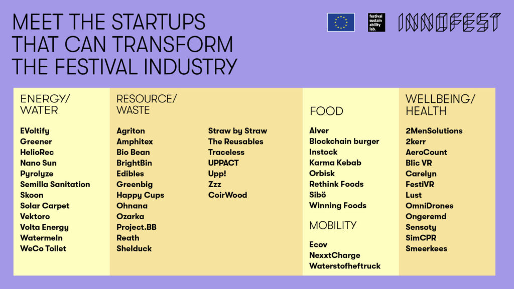 Door met deze startups samen te werken op festivals en evenementen, kan de sector een voorbeeldfunctie vervullen voor bezoekers. Festivals zijn bij uitstek een fantastische plek om innovaties uit te proberen, omdat de sector openstaat voor verandering. Hou deze startups dan ook goed in de gaten, want je komt ze komend festivalseizoen ongetwijfeld tegen! Is er iemand die je aan deze lijst wilt toevoegen (of misschien wilt verwijderen)? Laat het Innofest weten via deze pagina.