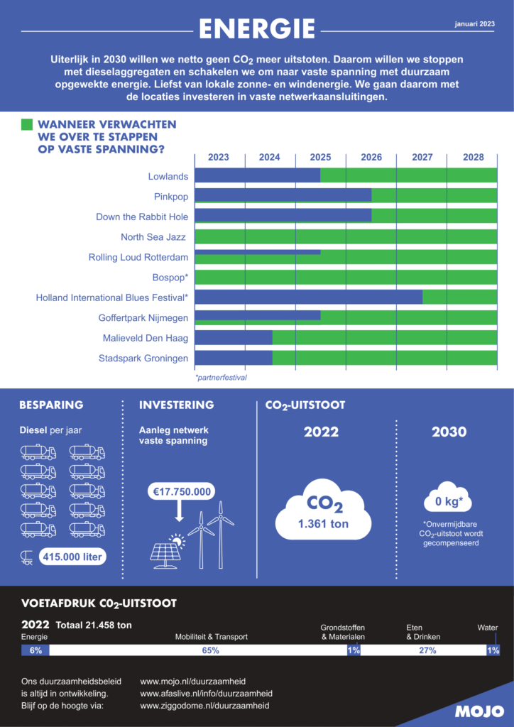 Voor de grote buitenconcerten en festivals van MOJO wordt jaarlijks meer dan 400.000 liter diesel gebruikt. Dat zorgt voor een uitstoot van 1.361 ton Co2. Doordat MOJO gaat stoppen met het grootschalig inzetten van dieselaggregaten, scheelt dat 8% op de Co2-voetafdruk van MOJO-outdoor shows. Er gaat veel geld geïnvesteerd worden in het aanleggen van lokale stroomnetwerken op alle buitenlocaties zodat er een aansluiting op het vaste net kan worden gerealiseerd.