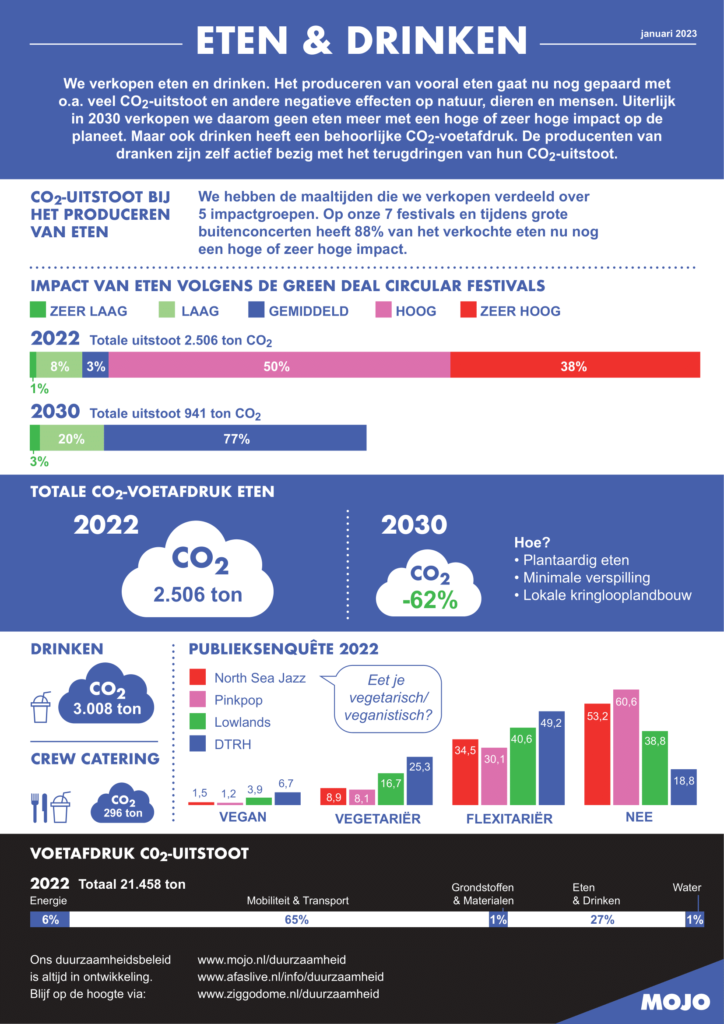 Voor MOJO, AFAS Live en Ziggo Dome gezamenlijk is het eten en drinken verantwoordelijk voor 8.238 ton kg Co2-uitstoot. Dat is 19% van het totaal. Daarvan komt ruim 3.000 ton van eten. Tijdens de evenementen van MOJO, AFAS Live en Ziggo Dome wordt daarom uiterlijk in 2030 gestopt met het verkopen van eten met een grote en zeer grote klimaatimpact. 84% van het huidige aanbod heeft nu nog een hoge of zeer hoge impact. Dit betekent de komende jaren een grote verschuiving van dierlijk naar plantaardig eten.