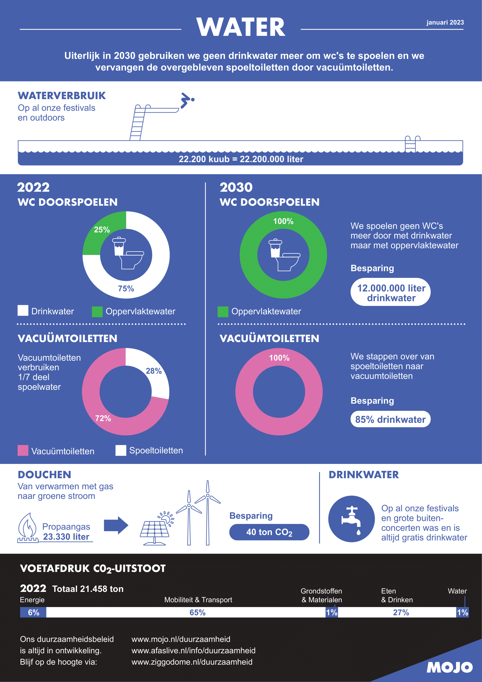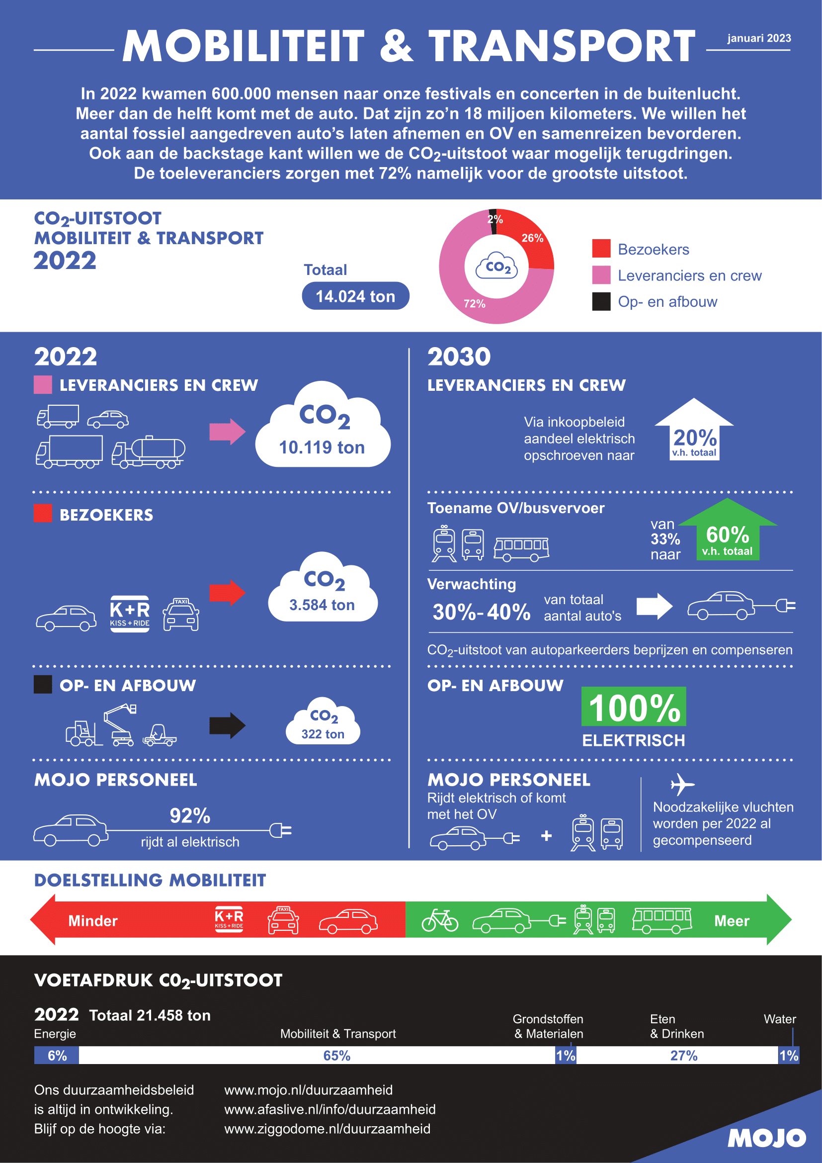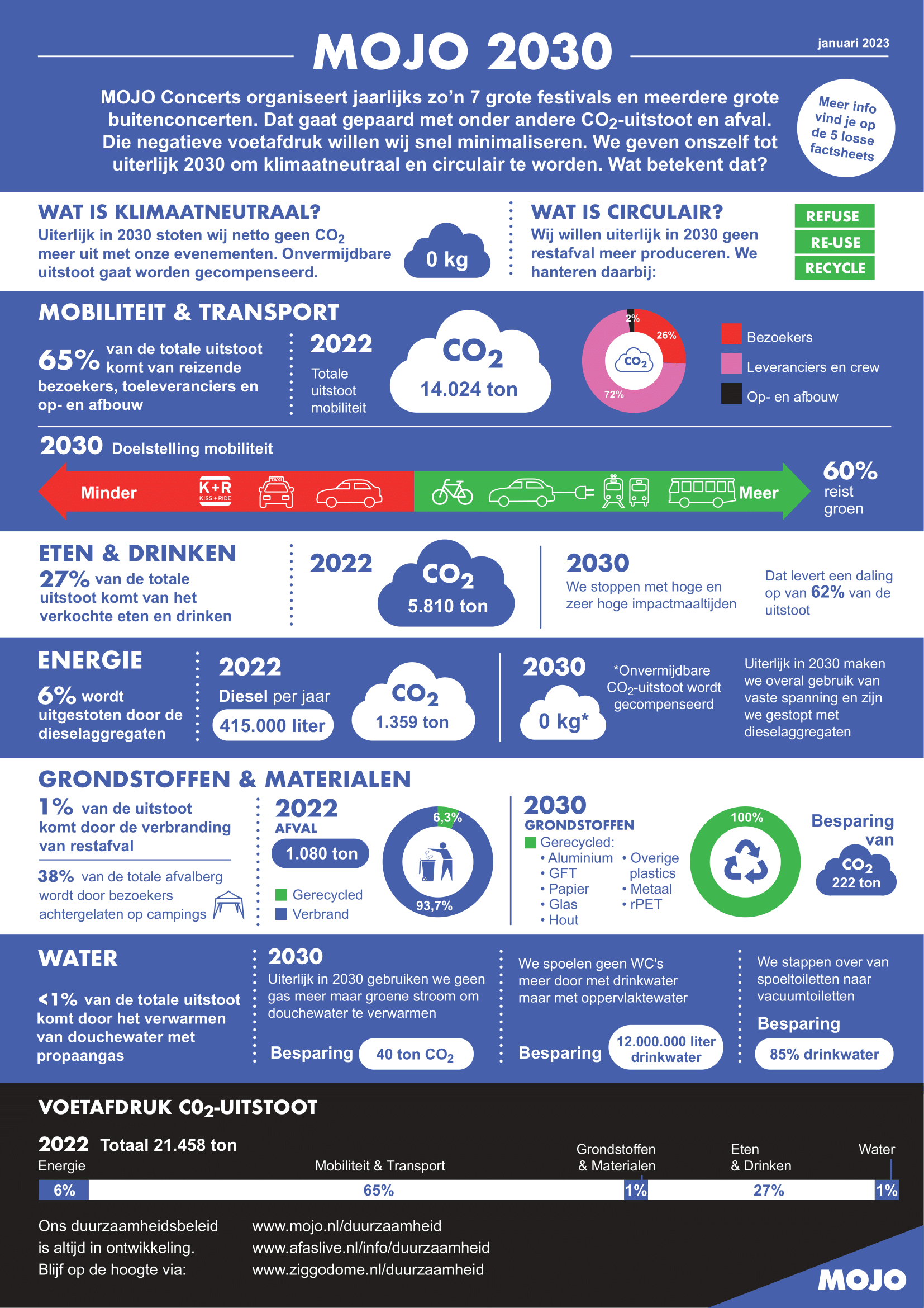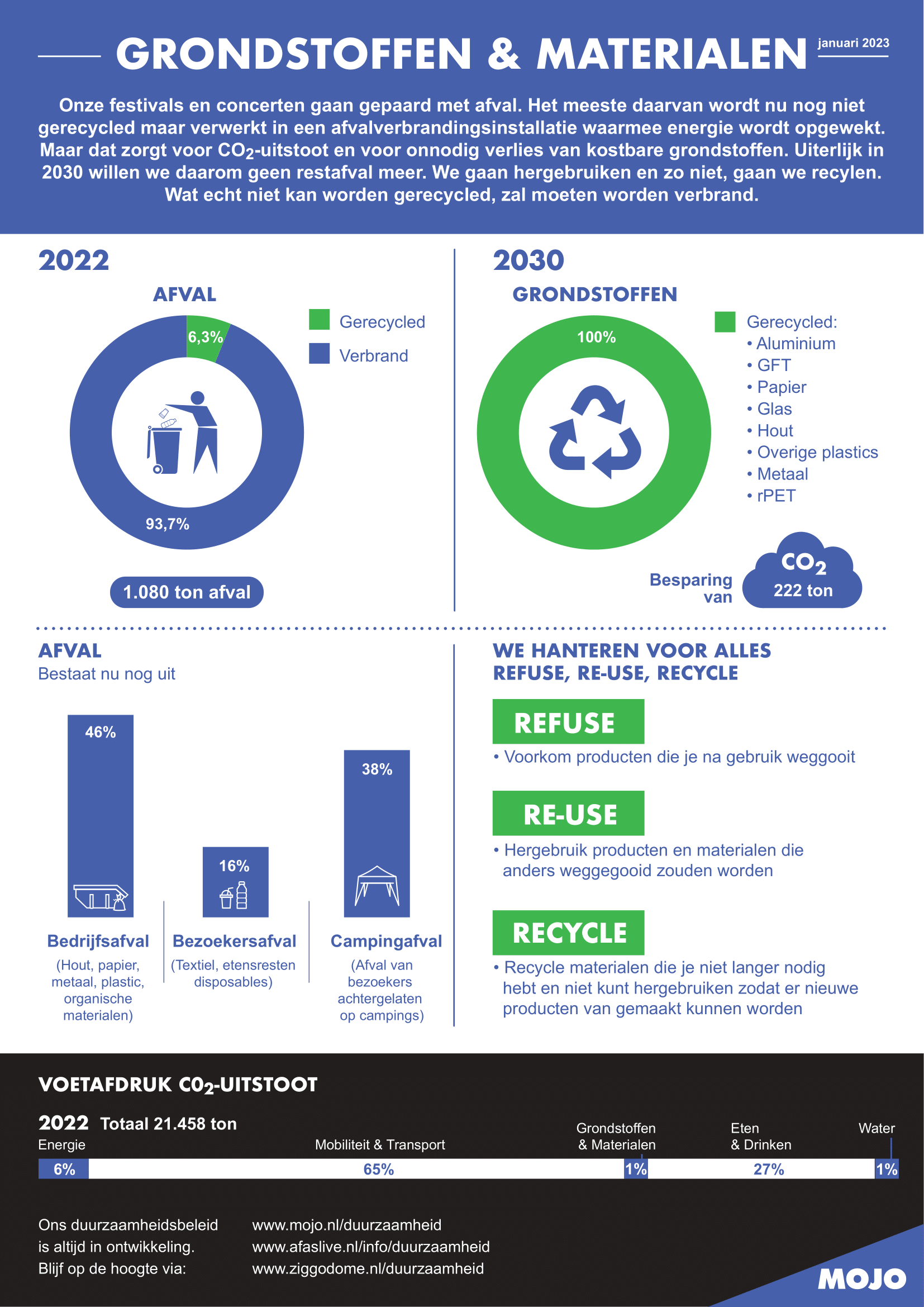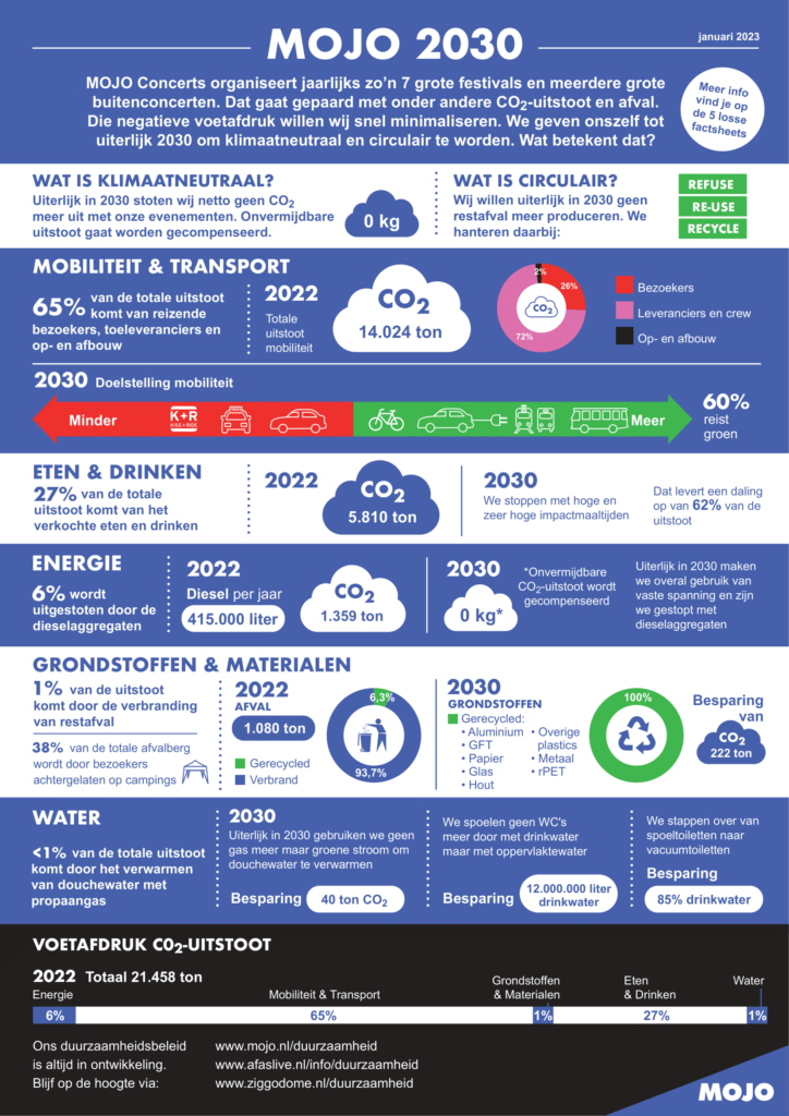AFAS Live, Ziggo Dome, de zeven grote festivals en meerdere buitenconcerten van MOJO produceren jaarlijks restafval dat wordt verbrand. Bij elkaar opgeteld levert dat een Co2-uitstoot op van 295 ton Co2. Hiervan komt 31% van het afval dat door festivalbezoekers op vier festivalcampings wordt achtergelaten. Uiterlijk in 2030 wil MOJO die uitstoot tot 0 reduceren. Een grote opgave waarbij we ook rekenen op de medewerking van onze bezoekers.