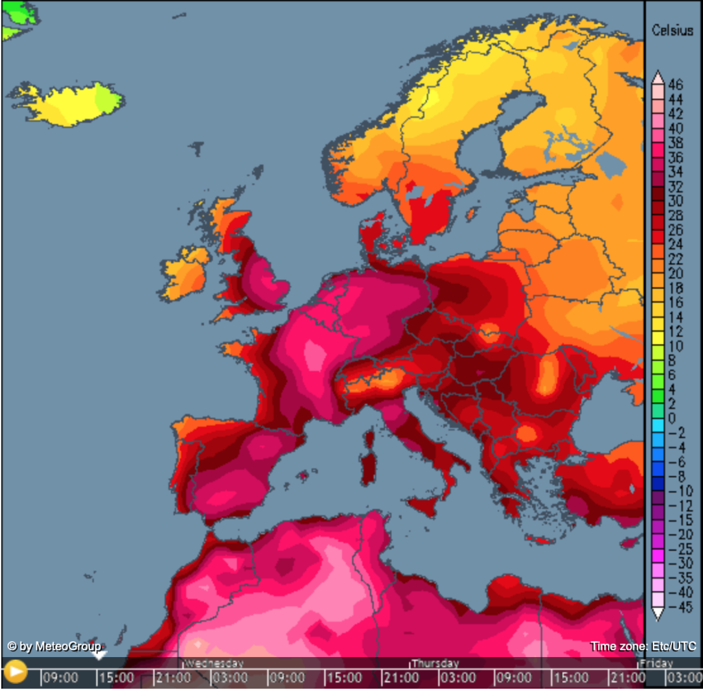 De weersvoorspellingen voor dinsdagmiddag, 19 juli 2022 – hoge temparaturen in heel Europa.