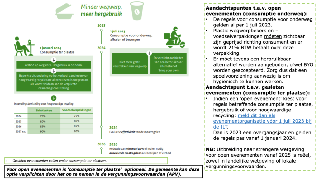 - Indien een ‘open evenement’ kiest voor regels betreffende consumptie ter plaatse, hergebruik of voor hoogwaardige recycling: meld dit dan als evenementorganisatie vóór 1 juli 2023 bij de ILT.